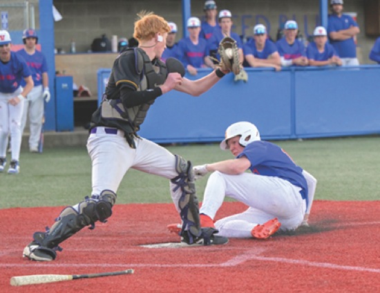 (5th inning) HV #11 gets his foot to home plate before Marshfield catcher #24 can drop his glove for a tag. SAFE! Scores HV's 5th run