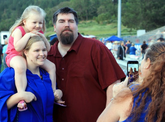 New Hidden Valley grad Jessica Billings-Rice poses with family friends Scott Ridge and 4-year-old Ciciley Meyer at the 2018 Hidden Valley graduation ceremony in Murphy on Wednesday. Taking the photo is Brenda Ridge. The Ridge family traveled from Post Falls, Idaho, to attend the ceremony.