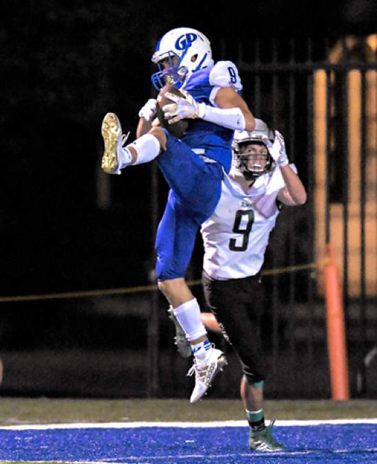 Photo by JOEL TAKARSH/for The Daily Courier, PIC #0519 GP #9 makes end zone interception beating out Summit #9 Cavemen win it 12-7.