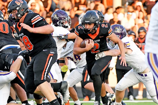Crater running back Jose Rodriguez (2) rumbles for yardage during the first quarter of the Comets' season opener against the Pirates on Friday, Aug. 29, in Central Point.