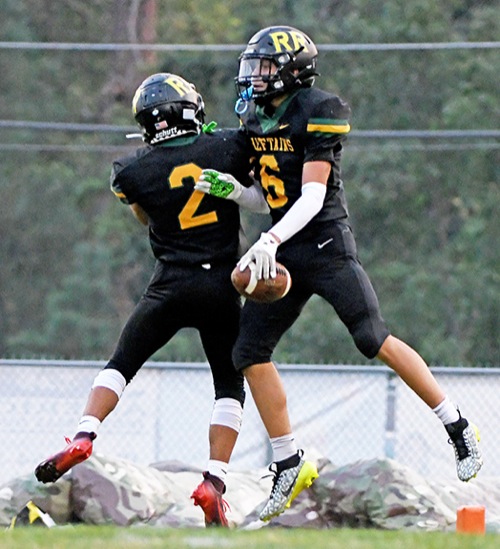 Rogue River's Gianni Gervasi (2) and Mason Scott (6) celebrate after Scott ran for a long touchdown on the Chieftains' first possession of the game against Monroe on Friday night, Sept. 5, at Chieftain Stadium.