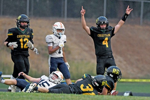 Rogue River's Trevor Dirks (4) celebrates after teammate Gary Rodriguez recovered a fumble by Monroe's Tate Oakes (15) in the first quarter on Friday night, Sept. 5, at Chieftain Stadium.