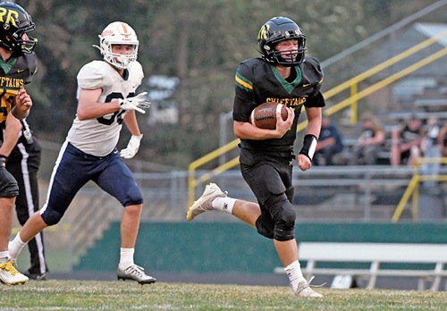 Rogue River's Trevor Dirks (right) breaks loose and heads for the end zone to score the second of his two first-quarter touchdowns against Monroe on Friday night, Sept. 5, at Chieftain Stadium.