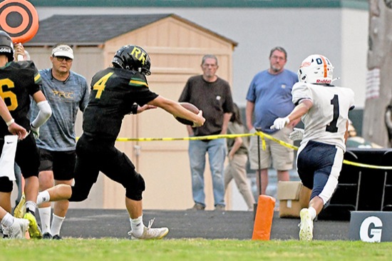 Rogue River's Trevor Dirks (4) extends the ball to break the plane of the goal line and score a Chieftain touchdown in front of Monroe's Dom Mora (1) in the first quarter on Friday night, Sept. 5, at Chieftain Stadium.