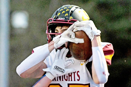 North Valley wide receiver Max Freedman hauls in a touchdown reception over a Hidden Valley defender in the first quarter to gave the Knights a 20-0 lead over Hidden Valley in Murphy on Friday, Sept. 19.