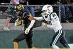 Destyn James (3) of St. Mary's hauls in a reception despite the tight defense of Rogue River's Trevor Dirks (4) and Mason Scott (left) during the first quarter on Friday night at Chieftain Stadium. The Chieftains defeated the Crusaders 65-42.