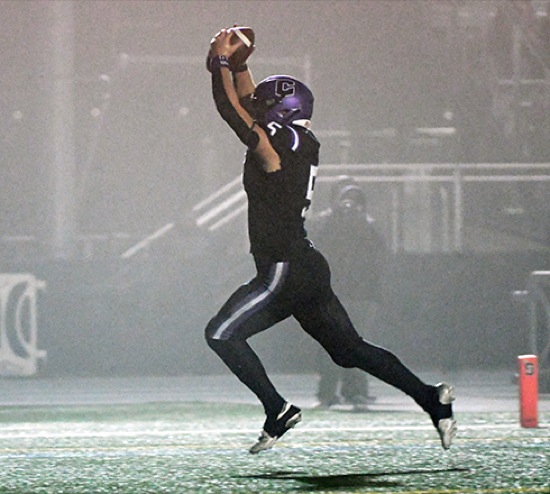 Cascade Christian's Alex Fiannaca celebrates after scoring a touchdown on a 20-yard pass from Deryk Farmer with 4:38 left in the third quarter during the Class 3A football state championship game on Saturday night at Summit High School in Bend. The Challengers defeated Burns 25-28 to win the state title and Fiannaca was named the Challengers' player of the game after catching three passes for 64 yards and two touchdowns while also racking up seven tackles on the defensive side of the ball.