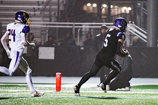 Cascade Christian's Alex Fiannaca scores the second of his two touchdowns on the night to break a 22-22 tie in the fourth quarter of the Class 3A football state championship game on Saturday night at Summit High School in Bend. The Challengers defeated Burns 35-28 to win the state title and Fiannaca was named the Challengers' player of the game after catching three passes for 64 yards and two touchdowns while also racking up seven tackles on the defensive side of the ball.