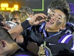 Burns defensive back Coltin Miller grabs the facemask of Cascade Christian's Caleb Scaglione during the Class 3A football state championship game at Summit High School in Bend on Saturday night. The Challengers defeated the Hilanders 35-28 to win the state title and complete a perfect 13-0 season.