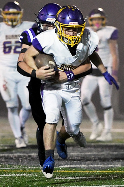 Cascade Christian's Alex Fiannaca wraps up and drags down Burns running back Tommy Winn during the Class 3A football state championship game at Summit High School in Bend on Saturday night. Fiannaca had seven tackles for the Challengers, who won 35-28 to capture their third state title in four years.